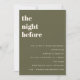 Ponha o tom para uma comemoração na moda com este Convite para Janto de Ensaio de Casamento Simples, Retron Verde Oleícola Minimalista e Negrito! Com um elegante fundo verde-oliva e uma tipografia limpa e inspirada por retrorreflectores, esta design consegue o equilíbrio perfeito entre a simplicidade moderna e o encanto vintage. O layout minimalista garante que o foco seja nos detalhes do seu evento especial enquanto mantém uma estética elegante e eterno. Perfeito para casais que amam designs subdeclarados, mas ousados!