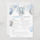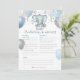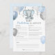 Este cartão de chá de previsão de bebê apresenta elefante de bebê azul e cinza com balões e confete. Perfeito para os seus hóspedes brincarem.
