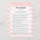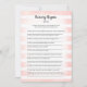 Aproveite este jogo de chá de fraldas do Nursery Rhymes Quiz no fundo das listras de aquarela suave, rosa e branca. Coelho bonito, branco e coelho nas costas com modelos criados para você.