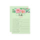 Celebrar a noiva de uma forma divertida e interativa com "Como você conhece bem a noiva?" Este jogo de chá de panela impresso ou profissionalmente impresso apresenta um belo design com flores cor-de-rosa e verde no topo, criando um olhar brilhante e feminino que é perfeito para qualquer chá de panela. No topo do jogo, o nome da futura noiva está listado sob a pergunta "Como você conhece a noiva?", escrito em uma bonito cor rosa que corresponde às flores. O resto do jogo é projetado em uma vibrante sombra de verde com texto preto, fazer fácil de ler e entender. Com 15 perguntas personalizáveis, você pode adaptar o jogo aos interesses e à personalidade da noiva, fazer-o um acréscimo único e personalizado a seu dia especial. Este jogo de chá de panela é a forma perfeita de envolver todos na celebração e testar o conhecimento dos amigos e familiares mais próximos da noiva. É uma maneira divertida e interativa de criar memórias duradouras e juntar todos para celebrar a noiva-a-ser. Quer você escolha fazer impressão do jogo ou fazer pedidos de cópias impressas profissionalmente, "Como você conhece a noiva?" é certamente um sucesso em qualquer chá de panela. No geral, "Como você conhece bem a noiva?" é uma adição obrigatória a qualquer celebração de chá de panela. Com seu design impressionante, perguntas personalizáveis e jogos engajados, ele certamente cria uma experiência memorável para todos os envolvidos. Então por que não adicionar esse jogo empolgante aos seus planos de chá de panela hoje e criar um dia que a noiva vai acarinhar para sempre!