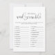 Este jogo de chá de panela word scramble apresenta uma fonte de script manuscrita divertida e um design moderno minimalista. Par com itens adicionais da Coleção JOLIE para uma aparência coesa. Tecla de Resposta: 1. Recepção 2. Matrimônio 3. Lua de mel 4. Toque 5. Cerimônia 6. Padrinhos de casamento 7. Bachelorette 8. Centerole 9. Noivado 10. Flor 11. Buquê 12. Primeira dança 13. Bridesmaid 14. Churrasco 15. Janto de ensaio 16 Fotógrafo 17. Registro 18. Hora do coquetel 19. Partido Bridal 20. Fidelidade 21. Oficial 22. Troca de Toques