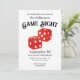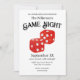 Estes convites de festas personalizados apresentam um tema da noite de jogos. Uma imagem de jogar dados é impressa no centro em um design vermelho-brilhante. A frase "Noite de Jogo" é impressa acima dos dados com um nome de família de amostra. Você pode personalizar os convites de festas de jogos para incluir seu próprio nome personalizado ou texto.