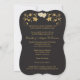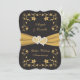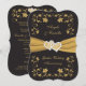 Este convite de aniversário de 50 anos de casamento, elegante em preto e dourado, tem uma fita com aparência dourada IMPRESSA com um par de joias de diamante IMPRESSAS e corações entrelaçados com brilho dourado sobre um fundo preto com flores douradas ao redor do convite em forma de suporte. Todo o texto é personalizável. POR FAVOR, OBSERVE - Se você alterar as fontes ou tamanhos de fonte, seu texto pode não caber mais corretamente. A Zazzle não editará nada para correções de digitação, desalinhamento ou qualquer outra coisa, e eu não verei seu convite. Tudo será impresso conforme aparece no seu monitor. Se precisar de ajuda com o convite, por favor entre em contato comigo ANTES de fazer o pedido. Se você precisar de outros itens correspondentes neste design, por favor envie um e-mail com sua solicitação para niteowl