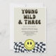 O convite de 3 anos e o convite de 3 anos para apresentação feliz convida crianças Legal e divertidas convites de festas de aniversário de 3 anos com tema Retroativo apresentando estilos retrorreflectores Legal com padrão verificado e rosto felizO texto diz "jovem, selvagem e três". Perfeito para a festa de aniversário de um menino.