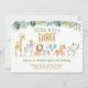 Este convite de aniversário fofo apresenta os animais cártaros com cor d'água com sotaques de folhas tropicais e falsos confetti de folha de ouro.