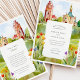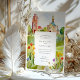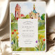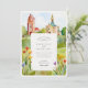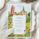 Celebre a sua união com este convite de casamento excepcionalmente artístico, que inclui uma bela representação aquática do icônico Mathildenhöhe em Darmstadt, Alemanha - uma joia do movimento Jugendstil (Art Nouveau). A frente captura a arquitetura distintiva, incluindo a Torre de Casamento (Hochzeitsturm) e a Capela Russa, fundida em aquarelas suaves e expressivas que destacam suas formas únicas e o encanto característico da virada do século. Flores silvestres cheias e estilizadas em vermelho, laranja, amarelo e roxo vibrantes enquadram graciosamente os detalhes do convite, adicionando um toque de beleza natural ao esplendor arquitetônico. O reverso, para "Os Detalhes Mais Finos", continua a cena encantadora, oferecendo outro vislumbre dessa colônia histórica e seu cenário pitoresco, complementado pelos encantadores sotaques florais. A técnica de aquarela fluida evoca um sentimento romântico, artístico, perfeitamente adequado para um casamento que aprecia a história, a arte e a beleza arquitetônica única. Este convite é ideal para um casamento de destino em Darmstadt, uma celebração com um tema Jugendstil ou Art Nouveau, ou para qualquer casal que procure um design sofisticado e culturalmente rico para o seu dia especial.