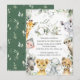 Invite friends and family in style and set the tone for your special day with this charming birthday invitation. Design features jungle animals (giraffe, monkey, zebra, lion, elephant, cheetah, meerkat, rhino) and eucalyptus leaves on white background.