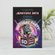 Convite de aniversário retrô, curioso, 50º para mulheres com tema karaokê, com ilustração ao estilo dos anos 90 de um microfone karaoke e varas e formas de brilho neon sobre um fundo de marinho escuro. Um favorito milenar, este laser dos anos 90, brilho neon, tema retro arcade combina-se perfeitamente com uma noite de karaokê para pessoas que adoram mostrar sua diva interior da discoteca e deixar tudo passar.