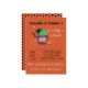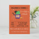 Um belo convite laranja para a festa de aniversário de Halloween de uma criança apresentando um gato preto de desenho por detrás de um cupcake com um gelo verde. Use os campos de modelo para adicionar suas próprias informações. O verso tem um simples padrão de bolinhas. © ArianeC Ilustrações — Todos os direitos reservados