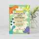 Convite de aniversário de dinossauro bonito com dinossauros amarelos, azuis, laranja e roxos sobre fundo foliar verde. Este convite também é uma modelo que você pode adicionar seus próprios detalhes para o dia especial de seus filhos. Disponível como convites impressos ou um download digital ou mesmo ambos.