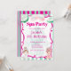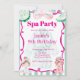 Adorable kids spa party birthday design with pastel stripes, spa robe illustration, sleep mask, and cute characters. Perfect for a girls' spa party celebration, this playful design creates excitement and sets a fun, relaxing birthday theme.