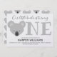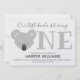 Nosso coala está fazendo um primeiro convite de aniversário para bebês. Este esquema de cores de convite é cinza em papel de shimmer pérolas com a palavra "Um" em letras grandes com uma ilustração de rosto koala como a primeira letra da palavra. Simplesmente, personalize este convite, adicione-o ao seu carrinho e feliz aniversário ao seu maravilhoso bebê! Koala Transformando Um Animal Fofo Primeiro Convite De Aniversário Design | ©Melissa Patton — Artista/Ilustrator