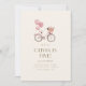 Este charmoso convite para festas de aniversário de temas franceses apresenta uma bela ilustração desenhada à mão de uma tênue vibração parisiense. Uma bicicleta cor-de-rosa, estilo francês e caprichoso, fica com um belo cesto de flores na frente e balões cor-de-rosa nas costas. As matizes suaves e os detalhes delicados evocam o romance de um café em Paris. Abaixo da cena, os detalhes da festa são apresentados elegantemente em um roteiro lúdico, mas refinado, convidando convidados a comemorar com um toque de talento francês.