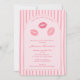 Convite de chá de panela "Kiss the Miss Goodbye" com design feminino moderno, apresentando elementos originais desenhados à mão. Com um fundo listrado moderno em tons de rosa, detalhes em arco e ilustrações de lábios beijando desenhados à mão em coral e vermelho, este design de cartão de convite segue as principais tendências. TODAS as cores de todos os elementos podem ser personalizadas (texto, listras, fundo, lábios e arco de fundo). Todas as obras de arte nesta coleção de convites são originais e de minha autoria (desenhadas e/ou pintadas à mão).