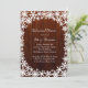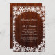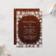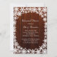 Lacy white, flocos de neve de inverno decoram a fronteira deste convite de janto de ensaio marrom escuro, que tem um fazer de fundo ilustrado de conselho de celeiro perfeito para o casamento no inverno rústico ou do condado.