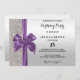 Convites de aniversário personalizados elegantes, glamorosos e sofisticados. Com um belo fundo de prata gradiente e lantejoulas pratas com uma borda separadora de um laço de faixa de efeito de seda roxa deslumbrante. Os detalhes do seu evento são impressos na frente deste cartão romântico, já a parte traseira tem apenas o fundo gradiente prateado. Este é um design moderno, romântico, sofisticado, elegante e fashion adequado para aniversários femininos. Todo o texto é totalmente personalizável para atender às suas necessidades.