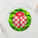 Uma ladybug de verificação de gingham vermelha e branca é colocada contra um fundo verde brilhante de relva de orvalho. Pode ser usado para um piquenique, uma festa de menina ou um chá de fraldas.