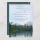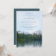 Esta cênica carta de convite para o casamento da paisagem rústica apresenta um esboço de pastéis de petróleo de um lago levemente ripado, mas calmo, com verdinhos distantes, árvores de cedro e estruturas rochosas refletidas sobre sua superfície, e montanhas distantes sob um céu azul com nuvens saborosas do ponto de vista de um caiaque de remor no lago ou um caminhante na margem oposta - texto misto é uma coordenação teal blue, como é o convite - de katz_d_zynes