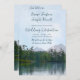 Esta combinação de cartas de convite/cartas de detalhes paisagístico apresenta a imagem de um lago levemente ripado, mas calmo, com verdinhos distantes, árvores de cedro e estruturas rochosas refletidas em sua superfície, e montanhas distantes sob um céu azul com nuvens sábia do ponto de vista de um caiaque de remador no lago ou um caminhante na margem oposta - texto de fontes mistas é um azul escuro coordenador - personalize os detalhes da cerimônia de núpcias na frente do cartão; detalhes descritivos adicionais estão na parte traseira do cartão - adicione facilmente um código QR ao site usando a Ferramenta de Design do Zazzle - por katz_d_zynes