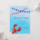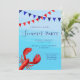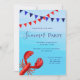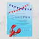 Um convite elegante para uma costa náutica pela festa de verão do mar, festa de praia ou mariscos. Água do mar azul como fundo e uma grande lagosta vermelha e bandeiras pretas e vermelhas como decoração. Modelos para detalhes de sua parte, informações.