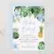 Este convite para chá de fraldas inclui folhas de palma de aquarelas de praia, florais de hibisco azul e um abacaxi tropical giro. Este convite divertido é a adição perfeita ao seu evento de festa de chá de fraldas de menina da Aloha luau. Par com qualquer coisa na Coleção Lalani para um olhar coeso.