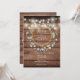 Uma atraente grinalda rústica de louro envolve uma borda de folha de ouro falso que inclui os nomes do casal feliz em um fundo de madeira rústica. Abaixo, os detalhes do casamento são apresentados em tipografia clássica e elegante. O verso apresenta as iniciais do casal dentro de uma grinalda rústica floral e de folha de ouro falso em um fundo de madeira rústica. Desenhado por Thisisnotme