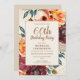 Pavimentação de cor laranja e burgundy/floral de outono elegante com brilho de ouro num convite de aniversário bronzeado 60º para mulheres. Entre em contato comigo para obter ajuda com a personalização ou para solicitar produtos Zazzle correspondentes para o seu partido.