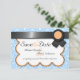 Belo casamento salve as datas com uma cor damasco azul-clara e branca e uma design de fita preta com laranja no topo.