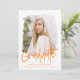 Convites de festa de formatura de tendências que incluem o dentro de fotos do formando de um quadro de máscara texturizado com "Formando" em um script manuscrito cor de laranja. Personalize a frente dos convites para festa de formatura de fotos adicionando o nome do formando, o nome da escola e o ano de graduação. O convite reverte para exibir seus detalhes de festa de formatura com um padrão listrado em laranja e branco.
