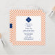 Padrão de quatrefoil laranja e convites de chá de panela azuis reais com monograma. Um padrão simples e elegante. O fundo é branco.