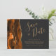 Este cartão elegante de salve a data moderno apresenta uma borda de ágata em aquarela laranja queimado aparada com brilho dourado falso. O texto personalizável combina fontes de escrita à mão em cor dourada, copperplate e itálico em um fundo escuro quase preto. O verso apresenta um design correspondente de ágata laranja queimado e dourado.