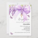 Um fundo branco elegante, decorado com uma grande lavanda, arco de cor roxa, flores de wisteria, borboletas e uma cruz de ouro. Personalize e adicione um nome e detalhes da parte.