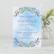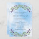 Céu branco e azul como fundo decorado com flores lavandas e verde de eucalipto. Personalize e seus nomes e detalhes. Voltar: adicione o URL do seu site de casamento ao código QR para obter mais detalhes e/ou RSVP