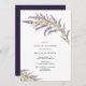 Um chá de panela clássico elegante de lavanda flutuante com aquarelas, com ramos e flores de caules botânicos de lavanda roxa, folhagem verde e castanha e caligrafia elegante.