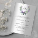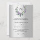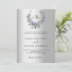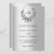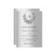 Um fundo de olhar mal prateado. Uma coroa floral feita de flores lavandas e de eucalipto verde de cor aquosa. Personalize e adicione suas iniciais, nomes e detalhes do monograma. Texto preto.