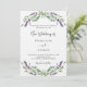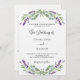 Um fundo branco decorado com flores lavandas e verde de eucalipto. Personalize e seus nomes e detalhes. Voltar: adicione o URL do seu site de casamento ao código QR para obter detalhes e/ou RSVP.