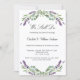 Um fundo branco decorado com flores lavandas e verde de eucalipto. Personalize e seus nomes e detalhes.