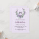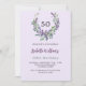 Fundo colorido lilático. Uma coroa floral feita de flores lavandas e de eucalipto verde de cor aquosa. Personalize e adicione seu nome, idade e detalhes da festa.