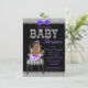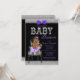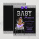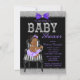 Convite de chá de bebê Roxo Lavanda, preto e prata com adorável bebê afro-americana vestindo um lindo tutu roxo e colar de pérolas sentada em uma cadeira listrada preta e branca elegante em um fundo glitter elegante preto, roxo e prata. Este convite de chá de bebê moderno em preto, roxo e prata é facilmente personalizado para o seu evento, basta adicionar seus detalhes no estilo de letra e cor de sua escolha. Você pode alterar a cor do fundo. Este é um design impresso sem glitter, laços, etc. reais.