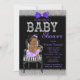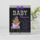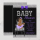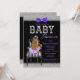 Convite de chá de bebê Roxo Lavanda, preto e prata com adorável bebê afro-americana vestindo um lindo tutu roxo e colar de pérolas sentada em uma cadeira listrada preta e branca elegante em um fundo glitter elegante preto, roxo e prata. Este convite de chá de bebê moderno em preto, roxo e prata é facilmente personalizado para o seu evento, basta adicionar seus detalhes no estilo de letra e cor de sua escolha. Você pode alterar a cor do fundo. Este é um design impresso sem glitter, laços, etc. reais.