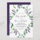 Esta lavanda rústica e um convite para o bebê do eucalipto são perfeitos para um chá ao ar livre simples e elegante. O design floral apresenta folhas de cor aquosa de eucalipto e verde com espinhos de flores silvestres roxas.