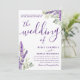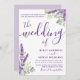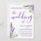 Um belo convite de casamento, com lavandas delicadas e eucaliputo pintados em aquarela. Caligrafia elegante em roxo. Arte original para você personalizar.