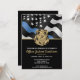 This design features a police force flag with black and white stripes, and a thin blue line stripe as well. The police badge and gold text sits above all of the party details for the retiring law enforcement officer, sheriff, captain, or chiefs retirement party details.