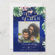 Tema de design moderno e elegante com folhas e flores de ilha tropical em azul real. Itens coordenados com este design podem ser encontrados na coleção anexa, que inclui convites de casamento, confirmação de presença, "save the dates", placa de boas-vindas, adesivos, programas, cardápio, convites de chá de noiva, jantar de ensaio, convites "nuestra boda", convites econômicos e mais. Este tema de design é perfeito para o seu casamento em destino, praia, ilha tropical, verão. Design por marca registrada LeahG.
