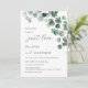 This elegant minimalist contemporary arched wedding invitation features watercolor painted eucalyptus leaves and gold foliage on a white background with a "nothing fancy just love" casual wedding quote.