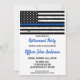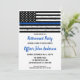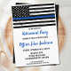 Convites de Aposentadoria da Polícia Thin Blue Line ou Convites de Formatura da Polícia. Celebre anos de serviço dedicado, ou celebre seu novo graduado na academia de polícia, e convide amigos e familiares para sua festa de aplicação da lei com este Convite de Aposentadoria da Polícia da bandeira Thin Blue Line e convites de formatura da academia de polícia - design da bandeira americana dos EUA em cores da bandeira da polícia, design desgastado. Este convite de aposentadoria de policial também é perfeito para convites de formatura da academia de polícia, altere o local na personalização. Veja nossa coleção para presentes de aposentadoria de policial, presentes de formatura de policial, brindes e suprimentos. DIREITOS AUTORAIS © 2021 Judy Burrows, Black Dog Art - Todos os Direitos Reservados. Convite de Aposentadoria da Polícia Aplicação da Lei Thin Blue Line