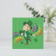 Convite com uma Ilustração de um leprechaun fofo feliz sorrindo e dançando, ele está vestindo um terno verde e um chapéu de copa alta e está cercado por respingos coloridos de arco-íris