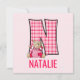 Um doce ursinho com a letra N convite de aniversário em rosa quente e tons de tons rosa mais leves em um padrão divertido de verificação de gingham.