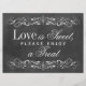 Direcione os convidados para a mesa de sobremesa ou lembrancinhas com este letreiro de "O Amor é Doce, Por Favor Aproveite um Petisco" com trabalho de rolinho em quadro negro vintage. As bordas ornamentadas em branco e a tipografia sobressaem-se contra o fundo escuro do quadro negro para um visual charmoso e rústico-elegante. Coordena com a suíte de papelaria completa com trabalho de rolinho na paleta de cores do quadro negro. Todo o texto é totalmente personalizável.
