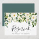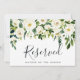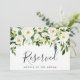 Indique lugares reservados no seu casamento com este letreiro floral elegante em tons de joia. Personalize com duas linhas de texto personalizado em caligrafia e letras maiúsculas modernas (mostrado com "Reservado" e o nome do convidado com lugar reservado), emoldurado por flores de aquarela branca e folhagem verde.